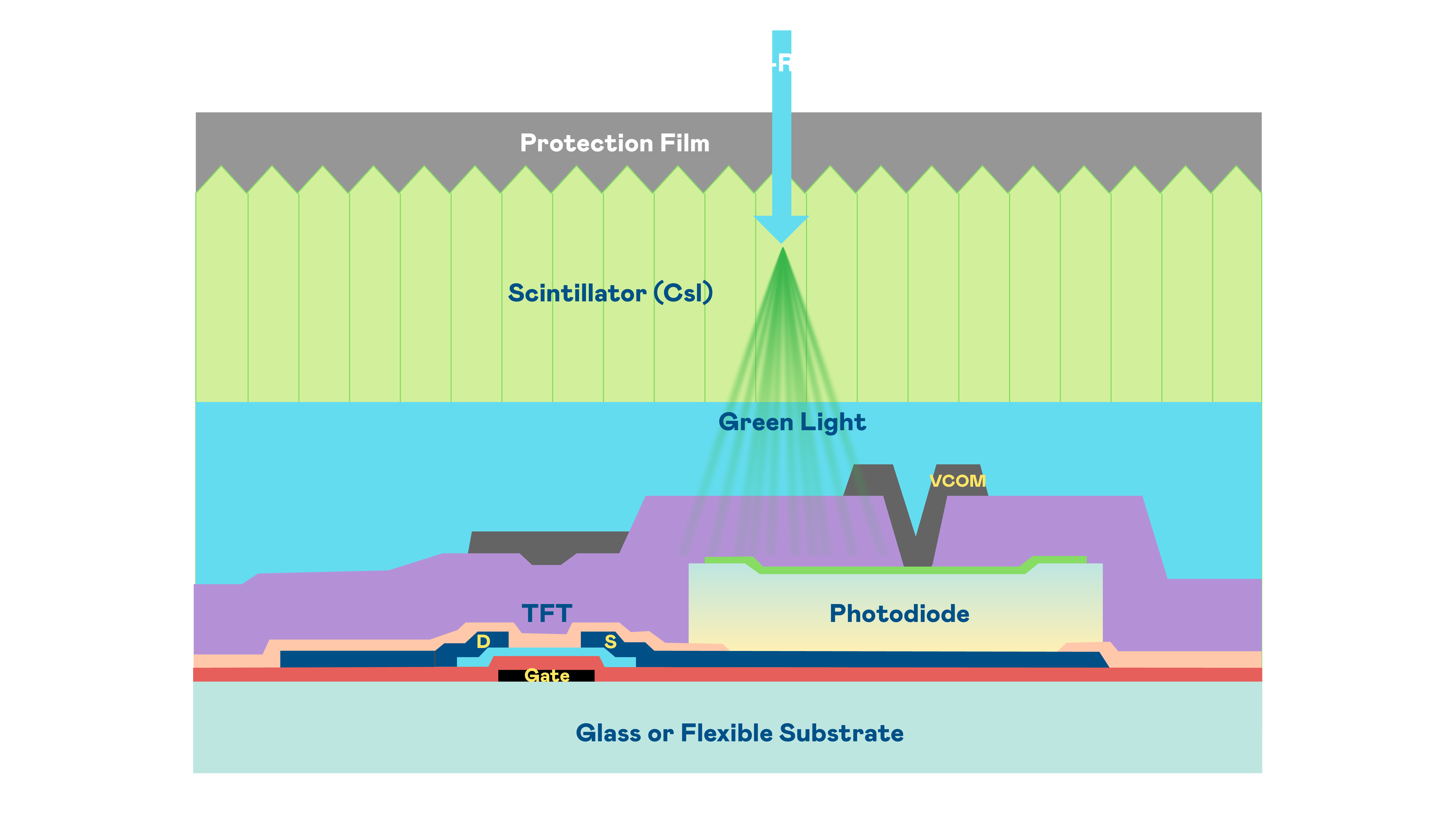 ag亚娱的X光影像感测阵列使用薄膜电晶体 (TFT) 作为每个像素的读取开关,搭配光电二极体(Photodiode)的光电转换元件,用以感测X光影像讯号。